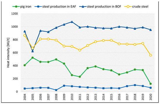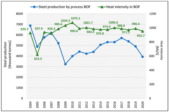 The heating of air and gas in smelter furnaces is aimed at increasing the combustion temperature. In the paper, two processes of steel production were analysed: BOF (Basic Oxygen Furnace) and EAF (Electric Arc Furnace). In the analysed period from 2004 to 2020 in the Polish steel industry, the average value of heat intensity per tonne of steel produced was higher in the BOF converter process (961.0865 MJ/t) with average annual steel production using this technology of 4994 thousand tonnes of steel than in the EAF electric arc furnace process (66.38824 MJ/t) with average annual steel production using this technology of 4030 thousand tonnes. In the crude steel production process alone, steel mills consumed 737.8908 MJ/t between 2004 and 2020 (Figure 4). The dynamics of steel production volumes by process and heat intensity in the analysed technological processes of steelmaking are shown in Figure 2 and Figure 3.