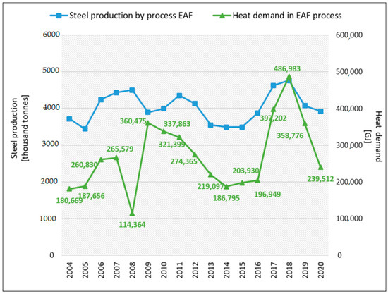 Total heat demand in the EAF process in Poland from 2004 to 2020. Source: Own elaboration.
