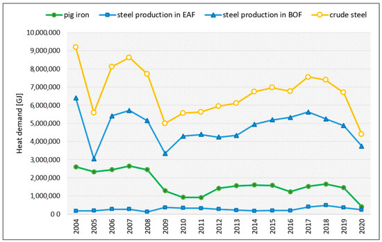 Total heat demand in all of the metallurgical processes in Poland from 2004 to 2020. Source: Own elaboration. Heat intensity for the category: crude steel is the sum of heat intensity for production of pig iron with BOF and EAF.