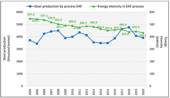Energy intensity per 1 tonne of steel in the EAF process in Poland from 2004 to 2020. Source: Own elaboration based on data from [11].