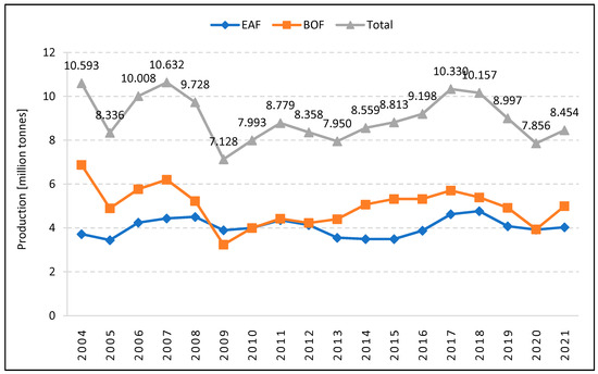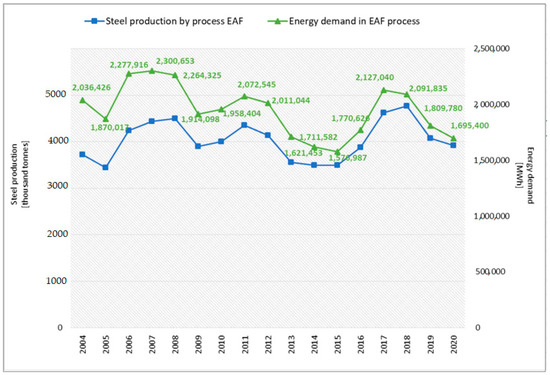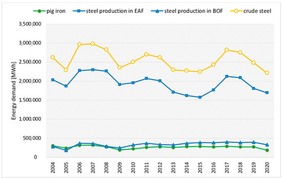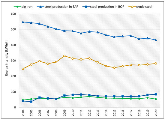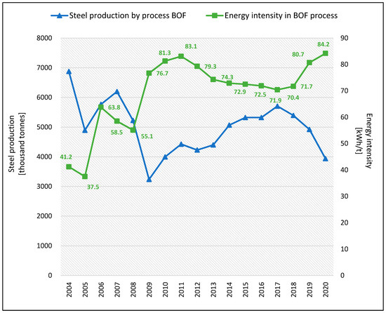 The associated BF + BOF processes are almost equally energy intensive, but their energy consumption is much lower than that of steel production using the EAF technology. The high energy consumption in the EAF process contributes to the overall quite high energy intensity of crude steel in Poland (the annual average per tonne of crude steel produced was 284.1454 kWh (Figure 10).
