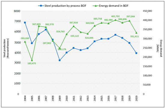 The variability in the heat intensity of technological processes in Polish steel mills in different years is directly influenced by the volume of steel production. Since in the Polish steel industry about 50% of steel is produced using the BOF process and the other 50% using the EAF process, it can be assumed that both processes (at the current stage) of technological change in Polish mills are equally important and the technologies used are ranked as key. The heat intensity is shown in the figures (comparison of Figure 2 and Figure 3). The EAF process is more sensitive to the economic situation for steel. In the event of a decline in market demand for steel, as occurred during the economic crisis in 2008 (Figure 2) and in 2020 (during the COVID-19 pandemic), the heat intensity of the EAF process showed a strong decline, while the heat intensity trend of the BOF process showed no decline (Figure 3). The heat intensity trend of the BOF process, compared to the trend of the EAF process, was increasing. The reason for this lies in the specifics of the processes; in the event of a downturn in steel, it is easier to reduce the capacity of electric furnaces (EAF) than to shut down blast furnaces, which is part of the BOF technology. BOF technology (Figure 4) has a higher heat demand than EAF technology. This situation of strong trend similarities is no longer repeated in the case of EAF technology (Figure 5), as this technology is more flexible compared to BOF technology (it is easier to decrease and increase the capacity of electric furnaces). With strong seasonal fluctuations for steel, EAF technology is more cost-effective to maintain than BOF technology. For this reason, EU industrial policy focuses on the development of micro-furnaces equipped with EAF technology. The heat intensity trend of the BOF process is similar (similar) to the trend of pig iron (pig iron) and crude steel (crude steel) production. This similarity is due to the fact that pig iron is only produced by BOF technology. This strong convergence of trends is particularly evident in the analysis performed in Figure 6, in which the heat demand is compared with the production volume of steel obtained exclusively with BOF technology. The course of both trends (Figure 6 and Figure 7) is identical, with trends showing decreases or increases over the same period. The electric furnaces that are being implemented in the steel industry are getting better and better every year in terms of energy requirements (analysis in Section 4.2, Figure 8).