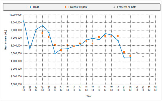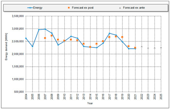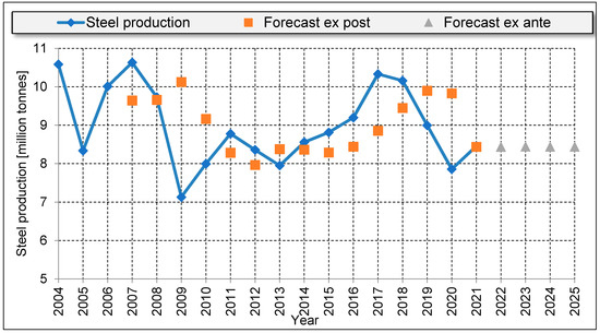 In the following section, the authors presented heat and energy forecasts for the Polish steel industry. The first step was to set the steel forecasts for 2022, 2023, 2024 and 2025. The steel production volume forecasts were used to determine energy and heat demand by 2025. About forecasting, the authors formulated the following research questions: