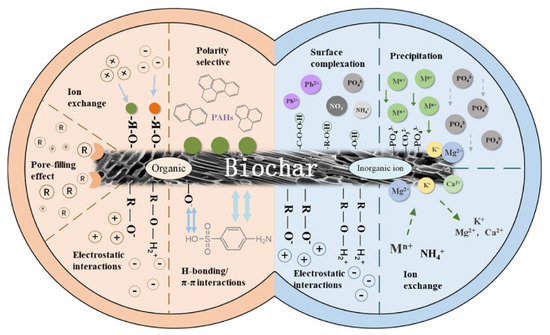 Organic contaminants such as personal care products, antibiotics, pharmaceuticals, plasticizers, and flame retardants are environmentally hazardous, societally ubiquitous, and structurally diverse chemicals [10]. Conventional wastewater treatment cannot remove such undegradable compounds; thus, more effective remediation methods such as adsorption have been developed. Microalgae-based biochar is a promising adsorbent that efficiently removes organic pollutants [73]. The removal mechanism of organic pollutants by biochar is due to one or a combination of the following mechanisms: electrostatic attractions, polar-selective interactions, pore filling, hydrophobic interactions, and p-p interactions. Ho et al. [74] investigated the removal of sulfamethoxazole (antibiotics) by N-doped graphitic biochar produced from Spirulina. The results showed that the derived biochar could absorb sulfamethoxazole via electron transfer. In another study, Zheng et al. [75] reported p-nitrophenol removal using biochar derived from chlorella. Nautiyal et al. [76] examined acidic Congo red dye removal using biochar produced from Spirulina. The removal efficiency of the investigated dye was 82% at pH of 2, initial dye concentration of 90 mg/L, and 0.2 g/100 mL biochar dosage. Figure 1 shows the biochar adsorption mechanism for both organic and inorganic pollutants.