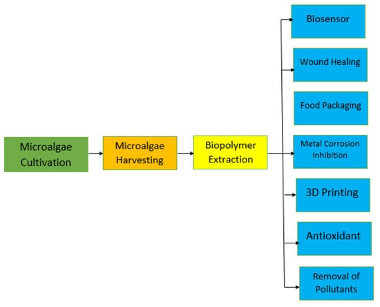 In comparison to petroleum-based synthetic polymers, microalgae-driven biopolymers are thought to be the most sustainable biomass feedstock for the synthesis of biopolymers in the direction of a global circular bioeconomy [16]. Recent research reports that when compared to petroleum-based polymers, algae-based biopolymers have better mechanical properties [17]. Additionally, algae-based biopolymers may be modified by adding additives, plasticizers, and compatibilizers to enhance the intermolecular force of contact between components, and boost material strength, flexibility, and durability [18,19]. Moreover, biopolymers are widely used in cosmetics, medicines, and food packaging. Furthermore, algal biopolymer could be used as a food additive due to its high nutritional content [20]. Utilizing innovative biopolymers such as chitosan dramatically improves processes such as medication delivery and tissue regeneration [21]. Biopolymers and their composites are intensively used in contemporary technologies such as 3D printing [22,23].
