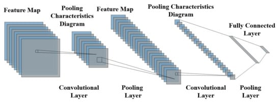 A convolutional neural network is a typical feed−forward neural network []. The structure of a simple convolutional neural network is shown in Figure 1, which generally consists of an input layer, a convolutional layer, a pooling layer, a fully connected layer, and an output layer. There can be several convolutional and pooling layers, and they are often set in alternating arrangements [].