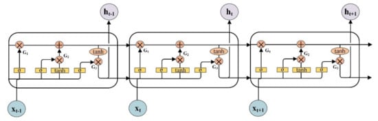 Long short−term memory networks are a special type of recurrent neural networks, which can be used to process sequential data. The self−looping structure of LSTM enables it to store temporal information about the inflow of memory units. It is very effective in learning long sequence dependence problems []. In order to overcome problems such as gradient explosion or gradient disappearance during training of traditional RNN models, three structures have been introduced in the LSTM to improve the RNN, namely forgetting gates, input gates, and output gates, respectively [], as shown in Figure 2.