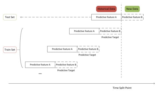 First, for historical data, we constructed one or more sets of data by intercepting data in different time windows. Then, each set of data was artificially divided into a historical window (corresponding to the solid part in Figure 5) and a future window (corresponding to the dashed part in Figure 5). Next, separate predictive features were constructed for each set of data, including historical features (predictive feature A) and future features (predictive feature B). At the same time, each set of data had a ‘future’ predictive target constructed from past time. Based on this reconstruction logic, we combined all the predictive features obtained as inputs to the model, such as historical operating data such as gas quality, pressure, flow, temperature, etc. for each gas source, pressure station, and customer node. We combined all prediction targets as model outputs, such as the calorific value or flow rate of gas at a downstream gas supply metering node for a certain time period in the future.