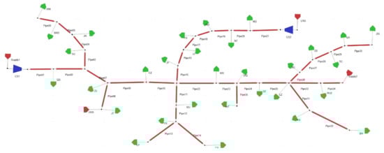 From the information collected on−site, it has 4 gas sources. These include an LNG supply terminal and a UGS supply terminal, 2 compressor stations, and 31 customer demand points (including city gate stations, plants, power stations, and downstream outlets). There are a total of 35 pipelines with a total length of 553 km and diameters of 406.4–1016 mm. The network generally operates at pressures of 6–10 MPa. The topology of the gas pipeline network is shown in Figure 7. In the diagram, the red polygons represent the gas sources, the green polygons represent the various types of consumers, and the blue polygons represent the pressure stations, which are connected to each other by nodes.