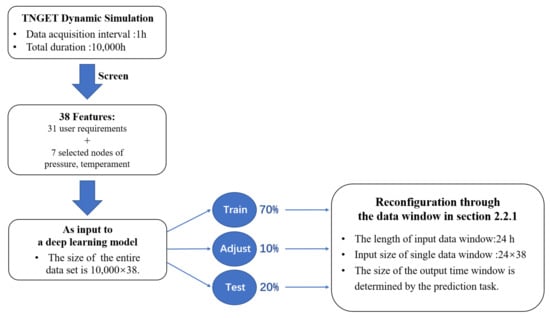 Before training the deep−learning model, the training data need to be reconstructed for the prediction model. In this paper, we used a sliding data window approach [] to partition and reconstruct the virtual operational data of the natural gas pipeline system obtained in the previous section. Figure 5 illustrates the data update diagram for the sliding data window.