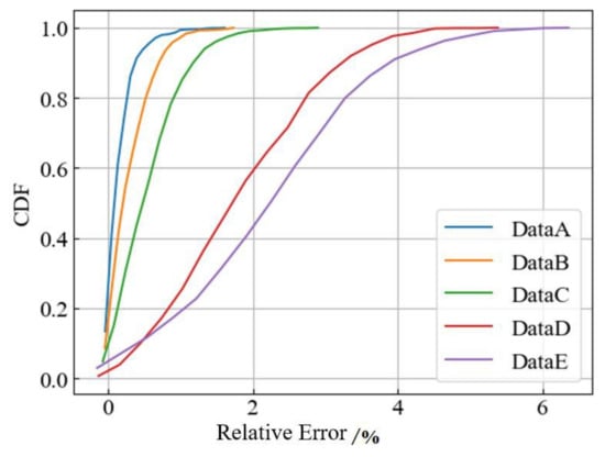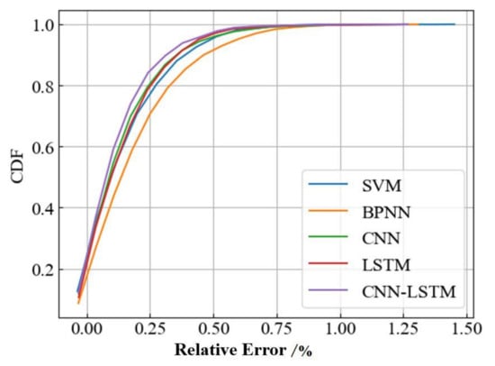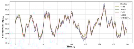 Figure 10 shows a comparison of the gas calorific value prediction results for the next 1 h from different models. It uses the four aforementioned error evaluation metrics as a benchmark for model prediction performance, and the results are shown in Table 4. From the figure and table, we can observe that this deep−learning model (CNN−LSTM) proposed in the method possessed higher accuracy and better fit compared to other benchmark models. It achieved a prediction accuracy of 99.89% for calorific values and was the only model with an R2 greater than 0.95. Figure 11 shows the CDF of the relative errors in the prediction results of the different models. It depicts the instability of the model prediction results due to the dynamics of the system state changes (caused by upstream gas quality changes and downstream user demand fluctuations). The results show that the established deep−learning model had better control over the prediction errors and the prediction performance was more reliable compared to the results of other models.