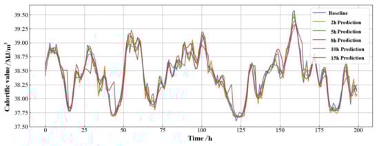 In general, longer prediction times can provide better decision support for gas quality analysis and metering management in pipeline networks. However, the size of the forecast output time also has a direct impact on the predictive capability of the model in the method. For this reason, the prediction task was tested by predicting the calorific value of the gas in the pipeline network for the next 2, 5, 8, 10, and 15 h respectively. Figure 12 shows the prediction of the gas calorific values by the deep−learning model built at different prediction time scales. It can be seen that as the prediction time increased, the prediction results beaome less accurate, and the fit became worse. This is because the strength of the relationship between the current and future states of the gas in the pipe network weakens with increasing prediction time, correspondingly making it more difficult for the neural network to learn this interrelationship.