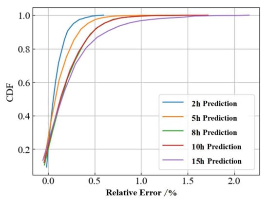 The results for each of the error evaluation metrics are displayed in Table 5 and the CDF for the relative error values is shown in Figure 13. From these results, we can observe that as the prediction time increases from 2 to 15 h, the values of the model MAE, RMSE, and MAPE change by a factor of nearly three. However, there was a more significant decrease in the R2 values of the model after 8 h. The difference in CDF between 8 and 5 h in the relative error CDF plot was greater than the difference between 5 and 2 h. This indicates that the deep−learning model was able to guarantee more accurate and reliable results for predictions within 5 h. In addition, with a prediction time of 15 h, the computation time of the deep−learning model built in this study was 1.3172 s, which was only 1% of the computation time of the physical simulation model (162.3357 s).