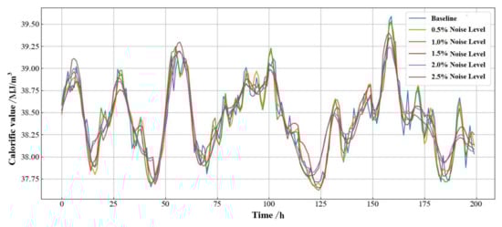- Generally speaking, field−collected data are noisy. To illustrate the effectiveness of the proposed method in dealing with different noise disturbances, we introduced five levels of artificial noise (i.e., ±0.5%, ±1.0%, ±1.5%, ±2.0%, ±2.5% Gaussian white noise) for comparison experiments;