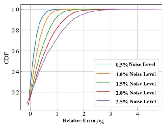 Figure 14 and Figure 15 show the CDF comparison of the predicted calorific value and the relative error of prediction for the next 2 h at different noise levels, respectively. From the figures, we can observe that there was a relatively significant decrease in the model prediction as the noise level increases. The results for each of the evaluation indicators are shown in Table 6. It can be seen that the values of the model MAE, RMSE, and MAPE increased by nearly four times at different noise levels. It reflects the fact that the average relative error of the model’s true predictive capability, although generally maintained at a low level, was considered unacceptable when this parameter was greater than 0.5% in terms of industry technical requirements. This suggests that the model’s predictions are unreliable when the noise level was above 1.5%. Furthermore, we can observe a very significant decrease in R2 values from 1.0% to 1.5% noise. This indicates that the model was not able to extract the spatial and temporal evolution of the gas state within the pipe network well when the noise disturbance is more severe. Therefore, by reducing the noise level to below 1.0%, the model can be effective in making predictions.