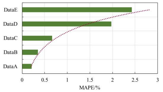 Comparisons of prediction accuracy for the five input data missing models are shown in Figure 16 and Figure 17. It can be visually observed from the graphs that the model maintained good prediction accuracy and stability of control over errors when some of the measurement data were missing less. For example, the prediction error results in Figure 16 for the missing Data B and Data C data model. However, when certain key data (e.g., pressure at some important driving nodes) were missing more, it was difficult for the model to fully extract and learn the dynamic characteristics of the non−linear process in the pipe network. This led to a significant reduction in both the fit and accuracy of the model predictions. This can also be seen in the gap between Data C and Data D in Figure 16 and the trend line in Figure 17.
