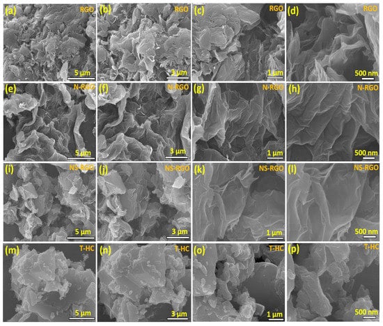 FE-SEM surface images of the as-prepared different magnification microstructural surface morphologies of (a–d) RGO, (e–h) N-RGO, (i–l) NS-RGO, and (m–p) T-HC.