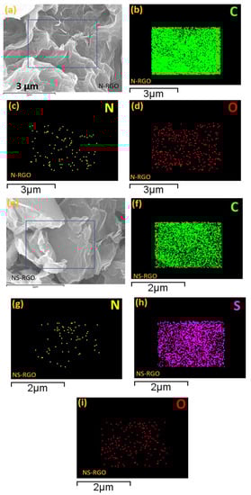 (a,e) FE-SEM surface morphologies with EDS elemental maps (b–d) C, N, O maps (N-RGO), and (f–i) C, N, S, and O maps of (NS-RGO).