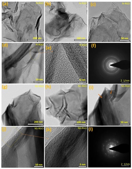 The N/S co-doped RGO samples exhibited a very tiny lamellar structure with separate folded edges and curved shape layers profiles (Figure 4g–i). In Figure 4j,k, the square box with aero marks represents the bilayer distribution in clear fringes. Overall, the N-RGO and NS-RGO materials have highly wrinkled surfaces because of the annealing effects. The as-prepared N-RGO and NS-RGO showed highly intense ordered ring patterns confirming the crystalline nature of the nanosheets (Figure 4f,l). The selected area electron diffraction (SAED) pattern of N-RGO (Figure 4e), and NS-RGO (Figure 4l) revealed distinct lattice fringes. FE-TEM images also confirmed that very thin N-RGO and NS-RGO nanosheets with surface morphologies similar to their single-step annealing technique for reduction with heteroatoms doped in graphene nanosheets had similar surface morphologies.