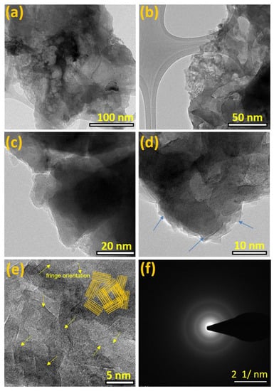 The NS-RGO and T-HC samples were examined by HR-TEM for further characterization of the surface morphology and structure. N-RGO showed a crumpled structure, interconnected, with less agglomeration of crosslinked graphene nanosheets (Figure 4a–c). Further magnified views (Figure 4d,e) revealed aero-marks divided by the atomic lattice fringes to construct a two-dimensional framework.