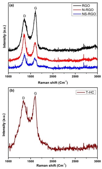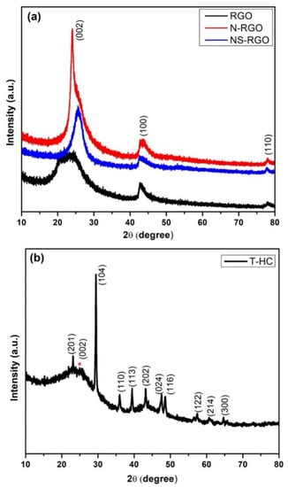 XRD was used to examine the crystal structure and phase purity of the as-prepared RGO, N-RGO, NS-RGO, and T-HC materials. Figure 6a presents XRD patterns of RGO, N-RGO, and NS-RGO. The XRD pattern of the RGO revealed several peaks at 2θ—24.37°, 42.78°, and 77.96°; N-RGO displayed peaks at 2θ—24.01°, 43.13°, and 78.05°; NS-RGO revealed peaks at 2θ—25.59°, 42.70°, and 77.78°. These peaks were indexed to the (002), (100), and (110) planes of the hexagonal phase of graphitic carbon (JCPDS 00-008-0415). These XRD peaks confirm the reduction of GO (RGO), and that RGO, N-RGO, and NS-RGO had good crystallinity [45]. Figure 6b shows the XRD peak of the prepared-HC material. The red star marks (*) were assigned to carbon characteristic peak ranges at 2θ—23° to 26°. All the XRD peaks were very well positioned at 2θ—23.31°, 26°, 29.4°, 36.02°, 39.48°, 43.16°, 47.61°, 48.60°, 57.43°, 60.61°, and 64.70° for (201), (002), (104), (110), (113), (202), (024), (116), (122), (214), and (300) the hkl plane of the hexagonal phase of T-HC, respectively, (JCPDS PDF #00-005-0586). All carbon materials (RGO, N-RGO, NS-RGO, and T-HC) displayed good crystallinity and were thermally reduced RGO with doping N-RGO and NS-RGO.