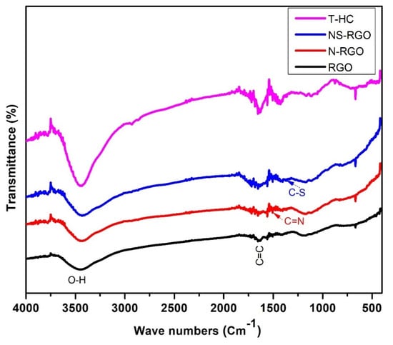 FTIR spectroscopy is a valuable technique for identifying the functional groups of synthesized materials in the recorded region between 4000 and 400 cm−1. Figure 8 presents the FTIR spectra of the RGO, N-RGO, NS-RGO, and T-HC. The FT-IR transmittance curves at 3449 cm−1 were attributed to the –OH symmetric and asymmetric stretching vibrations. The absorption band at 1648 cm−1, 1510 cm−1, and 1375 cm−1 is assigned due to (C=C), (C=N), and (C–S), respectively. The vibrational band at 1433 cm−1 for the C–H bending vibrations was attributed to the residual of nitrate ions [47].