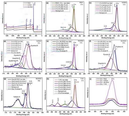 (a) XPS survey scan spectrum of RGO, N-RGO, and NS-RGO; Deconvoluted XPS spectra of (b) RGO-C 1s, (c) N-RGO-C 1s, (d) N-RGO-N 1s, (e) NS-RGO-C 1s, (f) NS-RGO-N 1s, (g) NS-RGO-S2p, and (h)T-HC-C1s; (i) Overall comparative spectra of O 1s.