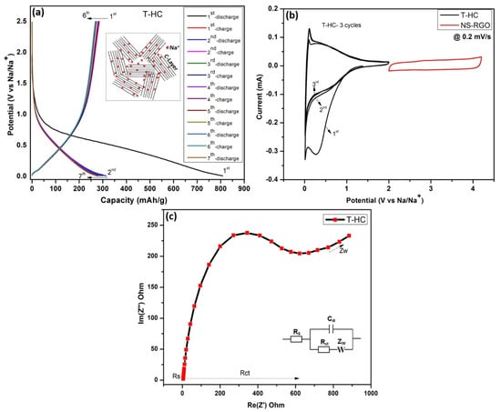 Figure 10a shows the GCD profiles for the pre-sodiation performance of a NIB half-cell with seven galvanostatic charge–discharge (GCD) cycles over the potential range of 0.01–2.5 V(Na/Na+) at a current density of 0.1 mA. After the half-cell battery pre-sodiations, the Na+ ions are intercalated into hard carbon T-HC, and the initial charge–discharge specific capacities of T-HC were estimated to be ~315–275 mAh/g. The capacitive properties of the biomass-derived Tamarind hard carbon showed good reversible curves resulting from the intercalation of Na/Na+ [51]. Figure 10b shows the CV curves of the T-HC anode with a scanning voltage range of (0.01–2.5 V), and NS-RGO cathode with a voltage range of (2.0–4.2 V) at a scan rate of 0.2 mV/s. The hard carbon anode T-HC shows three oxidation and reductions CV cycles (T-HC vs. Na+), where the first cycle conducted CV@0.2 mV/s with a wide range of redox Na/Na+, whereas the second and third cycles showed gradual reductions of potential ranges up to 0.01–2.0 V, where the Na+ ion redox part of the low potential is 0.01 and 0.276 V. The cathode (Na+ versus NS-RGO) electrodes are cycled in the voltage range of 2.0–4.3 V with a scan rate of 0.2 mV/s. The irreversible reduction peak of the first cycle is responsible for solid electrolyte interface (SEI) film formation at approximately 1.2 V. The disappearance of the irreversible peak in the second and third cycles shows that SEI film formation occurred only in the first cycle. EIS was used to explore the kinetic behaviors of half-cells using T-HC as the anode material (Figure 10c). The Nyquist plot showed that the small diameter of the semicircle of T-HC has small interfacial charge transfer resistance (Rct) of 616.5 Ω in the high-frequency region, which improves the conductivity and increases the specific capacity of the pre-sodiated T-HC anode material. Therefore, T-HC was selected as a suitable anode material for the successive construction of the NIC device. Figure 10c also presents the corresponding Randal’s equivalent circuit.