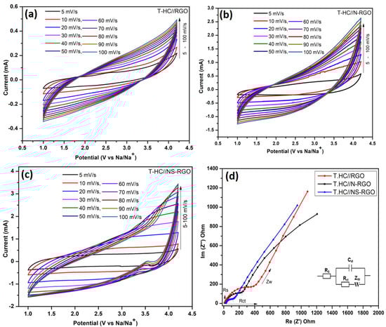 (a–c) Electrochemical tests of the full-cell for T.HC//RGO, T.HC//N-RGO, and T.HC//NS-RGO symmetric NIC device. CV curves were carried out at different scan rates at 5–100 mV/s with 1M NaPF6-EC-DMC with wide active potential ranges 1.0–4.2 V, (d) EIS for all NIC devices at 10 mHz–100 KHz.