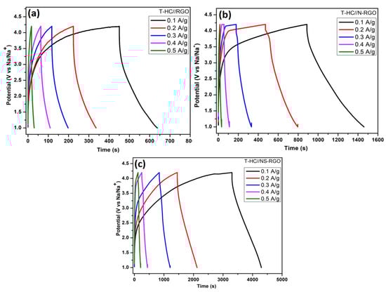 (a) GCD curves of T.HC//RGO, (b) T.HC//N-RGO, (c) T.HC//NS-RGO with wide active potential window ranges (1.0–4.2 V vs. Na/Na+) of symmetric Na-ion capacitor at different current densities 0.1–0.5 A/g.
