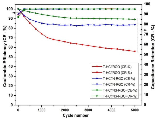 The number of charging and discharging cycles (cycling stability) is an important factor for determining the capacitance retention and coulombic efficiency of the electrode materials. Figure 13 shows the capacitance retention (CR-%) and coulombic efficiency (CE-%) of T.HC//RGO, T.HC//N-RGO, and T.HC//NS-RGO at a current density of 0.2 A/g for continuous 5000 charge–discharge cycles. The capacity retention of NS-RGO was 89.26% after 5000 cycles. N-RGO delivered 82.39% at 5000 cycles, and RGO delivered 53.92% at 5000 cycles. Hence, the NS-RGO is a potential cathode electrode material that retains good stability and provides higher specific capacity than N-RGO and RGO. Furthermore, the columbic efficiency CE- ~99% of all corresponding devices was confirmed.