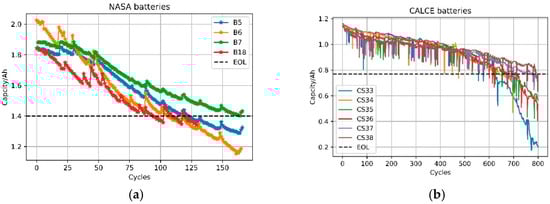 In this paper, the NASA dataset [36] and CALCE dataset [16] are applied to verify the effectiveness of the mentioned framework. The NASA batteries are 18,650 lithium-cobalt batteries with a rated capacity of 2 Ah. The aging experiment of lithium batteries mainly goes through two processes: charging and discharging. The charging process is mainly to charge in the constant current (CC) mode of 1.5 A until the voltage reaches 4.2 v, and then continue to charge in the constant voltage (CV) mode until the current drops to 20 mA. The discharge modes are different. B5, B6, B7, and B18 adopt 1C constant current discharge. Discharge was carried out at a constant current level of 2A until the battery voltage fell to 2.7 v, 2.5 v, 2.2 v, and 2.5 v for batteries B5, B6, B7, and B18, respectively, at room temperature. As shown in Figure 3a, the aging attenuation of different batteries are shown. The lithium battery decays to 70% of the rated capacity in 166 charge and discharge cycles. It is worth noting that the capacity of the lithium battery will increase abruptly in the process of performance degradation because of the relaxation of the physical and chemical reactions of the lithium battery during the rest period, realizing the regeneration of lithium batteries. The CALCE batteries have a graphite anode and a lithium cobalt oxide (LiCoO2) cathode with a rated capacity of 1.1 Ah. All CS2 batteries have gone through the standard constant current/constant voltage protocol. The constant current rate is 0.5 C until the voltage reaches 4.2 V, and then 4.2 V is maintained until the charging current drops below 0.05 A. Unless otherwise specified, the discharge cut-off voltage of these batteries is 2.7 V. The aging curve of CALCE batteries are shown in Figure 3b.