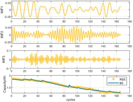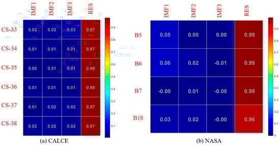 In this paper, the number of modes to be decomposed k is 4, noise-tolerance τ is 0, moderate bandwidth constraint α is 2000, and ε is 1 × 10−7. Figure 5 shows the original capacity data of the NASA B5 and the curves of the residual (RES) and intrinsic mode functions (IMFs) after the VMD method. Figure 6 shows the original capacity data of the CALCE CS34 and the curves of the RES and IMFs after the VMD method. RES not only maintains the degradation characteristics of the original data, but also is smoother than the original data and effectively eliminates the noise. It is obvious from the VMD separation results in Figure 5 that the capacity fading signal is successfully separated. Although the amplitude of the time domain waveform is different from that of the original signal, it does not affect the result. The separated capacity fading signal is smooth and undistorted. Therefore, if RUL is predicted directly based on the original data, it will be affected by noise fluctuations, which will greatly increase the prediction error. Meanwhile, the prediction of RES is unlikely to cause large errors because of the same trend between RES and the original data. Although the accuracy of prediction may increase for each IMF and the results of integration with RES, many components may increase the calculation time, thus increasing the computational complexity. As shown in Figure 7, in order to analyze the specific relationship between each component after VMD decomposition and the original data, spearman correlation coefficients are calculated. The correlation coefficient between each IMF component and the original value is lower than 0.1, while the correlation coefficient of RES is higher than 0.96. It shows that RES and the original data show a high correlation, and further explains that the prediction of RES changes can truly reflect the capacity degradation.