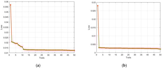 Figure 8. Descending trend of training loss with superparameter optimization: (a) CACLE dataset; (b) NASA dataset.