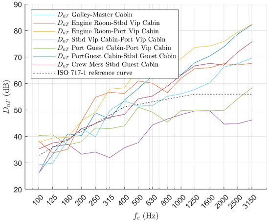 Standardized level difference of the Stbd Vip Cabin—Engine Room partition and reference values according to ISO 717-1:2020 [24].