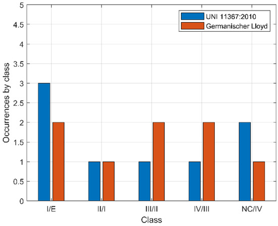 Only the Geramnischer Lloyd classification is used to confront the different results because of the similarity of the classification procedure between the UNI 11367:2010 and Germanischer Lloyd classification, while the other two classification procedures are different. In fact, the ABS classification and the RINA classification do not classify single partitions in different classes or consider different vessels and operations. Figure 6 highlights the different occurrences by class for the standardized level difference for the Germanishcer and UNI 11367:2010 classification procedure.