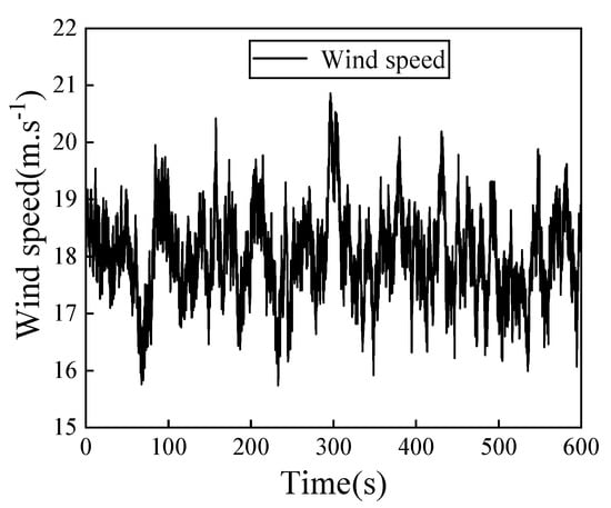 The wind spectrum uses the KAIMAL spectrum and the wave spectrum uses the PM spectrum. The wind speed and wave height are shown in Figure 5 and Figure 6. The wind speed is selected as 18 m.s−1, the wave elevation is 5 m, and under the same input condition, the contrast experiments are carried out under FAST basic variable pitch control and fractional order PID state feedback disturbance adaptive variable pitch control, respectively.