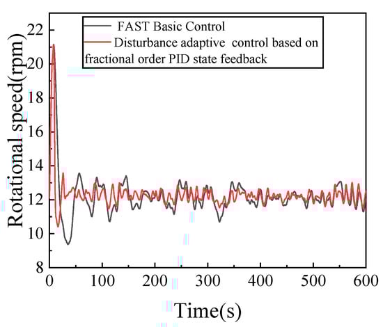 As can be seen from Table 3, under the disturbance adaptive control with fractional PID state feedback and the FAST basic control, the standard deviation of the rotational speed is 0.286 and 0.504, respectively. Compared with the FAST base control, under the disturbance adaptive control with fractional PID state feedback, the standard deviation of the rotational speed is reduced by 43.25%. Under the disturbance adaptive control with fractional PID state feedback and the FAST base control, the standard deviation of the generating power is 60.42 and 152.38, respectively. Compared with the FAST base control, under the disturbance adaptive control with fractional PID state feedback, the standard deviation of the generating power is reduced by 60.35%. This can be summarized as follows: under the disturbance adaptive control with fractional PID state feedback, the fluctuation of rotational speed and generating power is smaller, the generating power is more stable and the control effect is better.