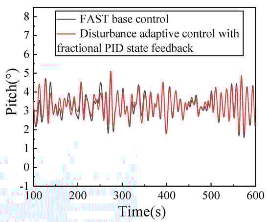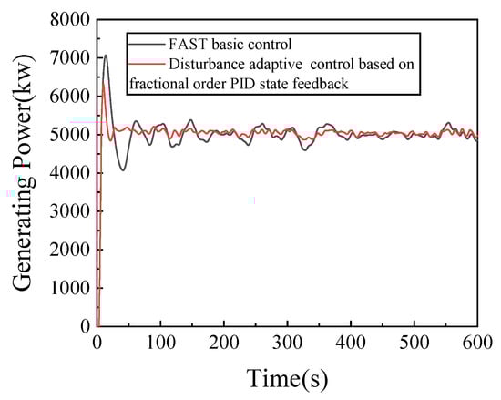 We mainly analyzed the results of wind turbine speed and power generation. Figure 7 and Figure 8 compare the rotational speed and generating power of the floating wind turbine under the two control modes, respectively. Compared with the FAST base control, the disturbance adaptive control with fractional PID state feedback significantly reduces the fluctuation of the rotational speed of the floating wind turbine, although the generating power of the two control methods can be stabilized at about 5 MW. Compared with the FAST base control, under the disturbance adaptive control with fractional PID state feedback, the generating power is more stable and the generating power overshoot is smaller. A detailed comparison of the rotational speed and generating power of the wind turbine is shown in Table 3. Because the generating power and rotational speed of the floating wind turbine are basically stable after 100 s, data from 100 s to 600 s are selected for analysis.