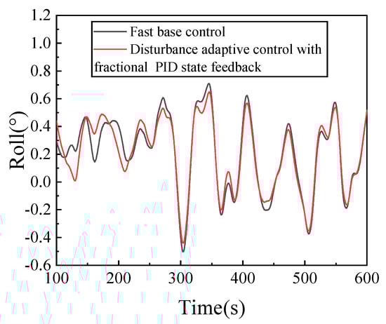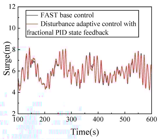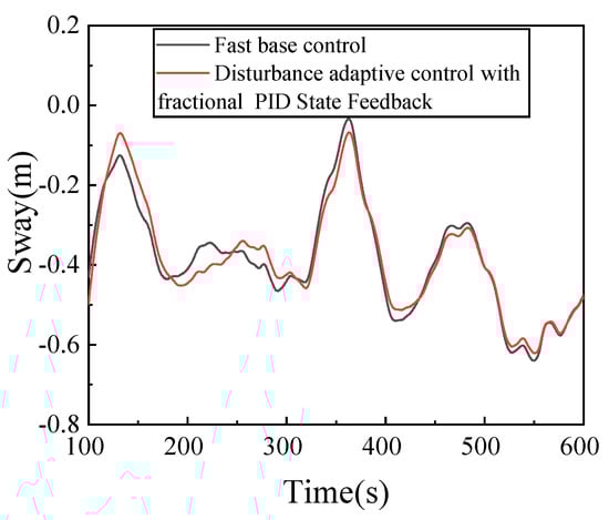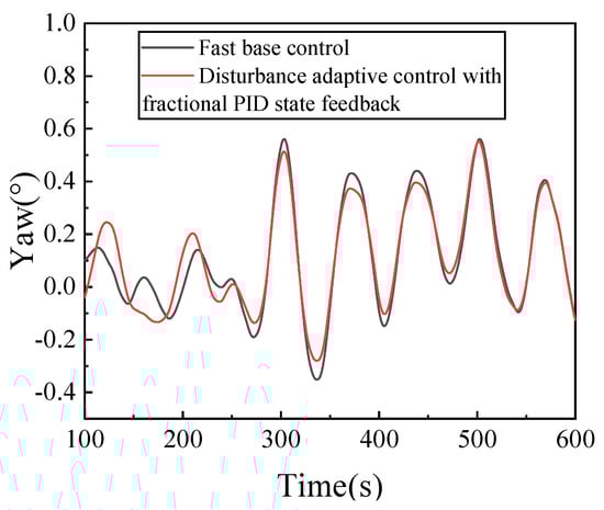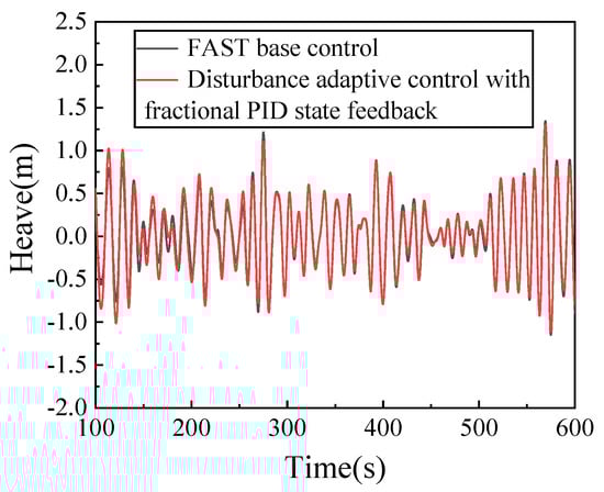 The load acting on the system will change in the process of varying the pitch of the floating wind turbine, which will affect the stability of floating wind turbine. Therefore, it is of great significance to consider the stability of floating wind turbine platform in the design and development of the method for varying the pitch control of the floating wind turbine. Figure 9 and Figure 10 are the comparison of the surge displacement and pitch angle under the two control algorithms. Specific data analysis is shown in Table 4. Under the FAST base control, the standard deviation of the surge displacement and pitch angle are 0.835 and 0.603, respectively. Under the disturbance adaptive control with fractional PID state feedback, the standard deviations of the surge displacement and pitch angle are 0.859 and 0.552, respectively. Compared with the FAST base control, under the disturbance adaptive control with fractional PID state feedback, the surge distance standard deviation is increased by 2.87% and the pitch angle standard deviation is reduced by 8.46%. Figure 11 and Figure 12 are the comparison of the sway displacement and roll angle under the two control algorithms; the specific data analysis is shown in Table 5. Under the FAST base control, the standard deviation of the sway displacement and roll angle is 0.138 and 0.267, respectively. Under the disturbance adaptive control with fractional PID state feedback, the standard deviation of the sway displacement and roll angle are 0.137 and 0.253, respectively. Compared with the FAST base control, under the disturbance adaptive control with fractional PID state feedback, the standard deviation of the sway displacement decreases by 0.721.44% and the standard deviation of roll angle decreases by 5.24%. Figure 13 and Figure 14 show the comparison of the heave displacement and yaw angle of the two control methods, and the specific data analysis is shown in Table 6. Under the FAST base control, the standard deviations of the heave displacement and yaw angle are 0.410 and 0.211, respectively. Under the disturbance adaptive control with fractional PID state feedback, the standard deviations of the heave displacement and yaw angle are 0.426 and 0.20, respectively. Compared with the FAST base control, under the disturbance adaptive control with fractional PID state feedback, the standard deviation of heave control is increased by 3.76% and the standard deviation of roll control is reduced by 5.21%. The results show that under the disturbance adaptive control with fractional PID state feedback, the fluctuation of the floating wind turbine platform in the four degrees of freedom of pitch, roll, sway and yaw decrease, while the fluctuation of surge and heave increase. The control algorithm also plays a certain role in maintaining the stability of the floating wind turbine platform.