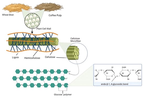A brief diagrammatic structure and chemical composition of lignocellulose biomass. Wheat bran and coffee pulp cell walls contain a thick layer made of cellulose, hemicellulose, and lignin. This is an illustration of the β-(1,4)-glycosidic bond, which Carboxymethyl Cellulase (CMCase) would act upon.