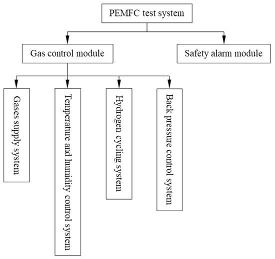 The automatic fuel cell test system is developed by introducing a control module based on the connection between lower machine and the upper computer [,,,]. Cheng et al. [] proposed a hydrogen fuel cell test system using the joint control of PLC (programmable logic controller) and MATLAB/Simulink to improve the gas control performance. Liu et al. [] designed a high-power PEMFC test system that used LabVIEW software and a fuel cell controller unit to achieve real-time monitoring, control, and fault diagnosis and to ensure a stable operation. Based on the PLC and LabVIEW platform, Peng et al. [] designed a test system for air-cooled self-humidifying PEMFC with the function of start and stop timing control, hydrogen exhaust alerting, etc. Rosli et al. [] designed a high-temperature PEMFC test system using LabVIEW and channel frame processor hardware, which could monitor the voltage and current generation and the inlet and outlet temperatures.
