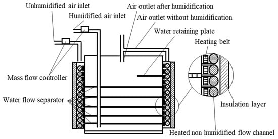 Based on a self-designed bubble humidifier with temperature and humidity regulation, the inlet humidity was controlled by mixing the dry air with humidified air. The profile of the humidifier is shown in Figure 3. First, the heating belt heated up the system according to the set temperature. Then, according to the difference between actual humidity and set value, the mass flow rates of dry air and humidified air were regulated based on PID technology via two mass flow controllers.