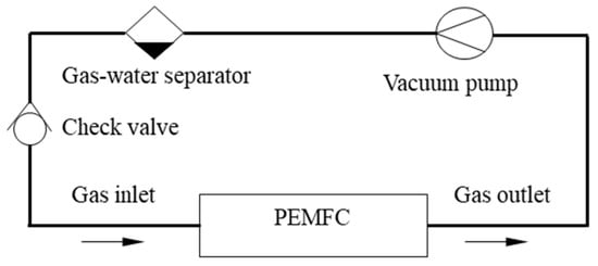 During the operation of PEMFC, the utilization rate of hydrogen is about 65–95%, and the direct emission will not only cause a waste of resources, but also bring huge safety risks []. The designed hydrogen cycling system was composed of a hydrogen circulation pump, a gas–water separator, and a check valve, as shown in Figure 4. The hydrogen circulating pump was used to pressurize the outlet gas, which would pass the gas–water separator to prevent excess water from the flooded membrane. The check valve was employed to prevent the gas counterflow.