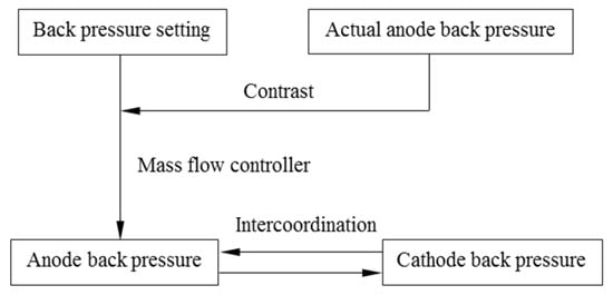 The back pressure system for regulating the internal pressure of PEMFC was designed by controlling the outlet flow at the anode and cathode. Meanwhile, the two mass flow controllers worked in coordination with each other to prevent the membrane damage caused by a high pressure difference. The flow chart of the back pressure control module is shown in Figure 5.