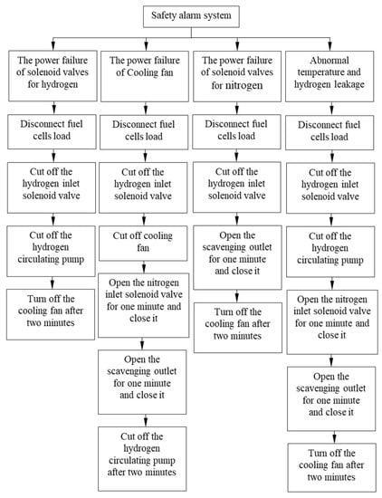 In order to avoid a potential safety accident during the operation of the PEMFC test system, an alarm module was designed to monitor the possible anomalies and make corresponding responses to hydrogen or nitrogen solenoid valve power failure, cooling fan power failure, temperature anomaly and hydrogen leakage. The specific workflow of the safety alarm module is illustrated in Figure 6.