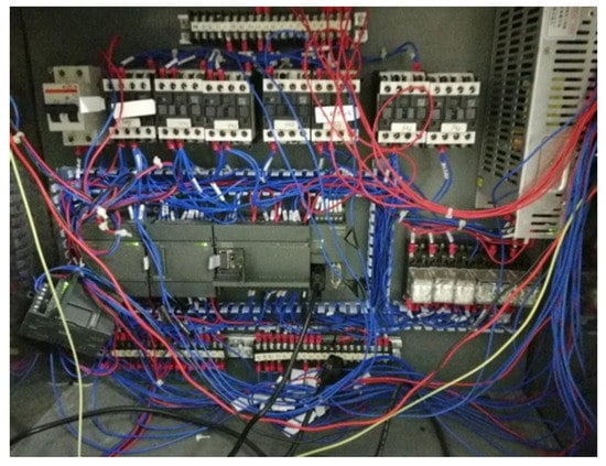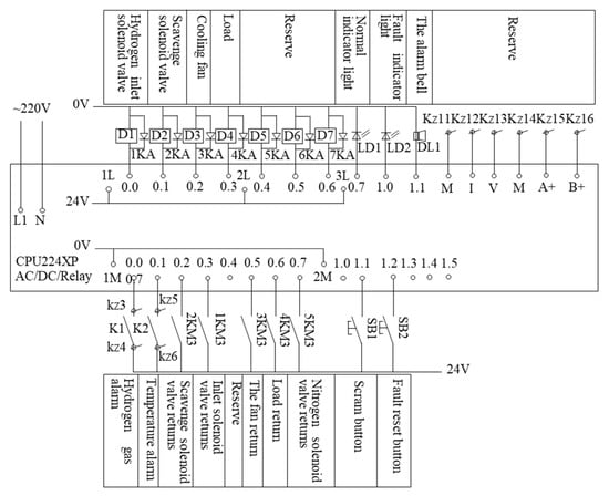 PLC is an important tool for developing independent automation systems, which has been widely used in implementing automated fuel cell test systems. In this study, a Siemens PLC S7-200 with CPU 224XP was used, which integrated 14 inputs/10 outputs for 24 digital I/O points, 2 inputs/1 outputs for three analog I/O points and seven expansion modules. The maximum expansion value was 168 digital I/O points or 38 analog I/O points. Two RS485 communication/programming ports had a PPI communication protocol, MPI communication protocol and freeform communication capability, with internal analog I/O, bit control feature, linear ramp pulse command, diagnostic LED, data logging, recipe function, etc. The electrical connection diagram and physical connection diagram are shown in Figure 7 and Figure 8, respectively. The data collected by PLC was the analog signal converted by the sensor, and the analog signal need to be converted into the corresponding physical values, including flow rate, temperature and humidity, pressure, etc. In addition, PLC control technology was used for the manual/automatic control, safety alarm and parameter-setting.