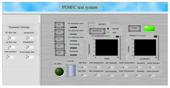 The human–machine interaction interface of the PEMFC test system was developed by LabVIEW as shown in Figure 9, including parameter-setting, manual/automatic switch, liquid water level display, start/stop switch, alarm signal light indicator, fuel cell I-V curve display, etc.
