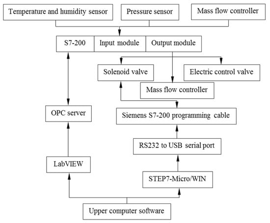 The EM232 module in Siemens PLCS7-200 was used to convert the analog signal collected by the sensor into the corresponding digital signal, which was stored in the PLC register, and then transmitted to the upper computer through the Siemens programming cable and RS232 to USB serial port. After processing the data results, the upper computer sent control instructions through the PLC and converted them into analog signals by D/A to control the execution components. The communication flow chart is displayed in Figure 10.