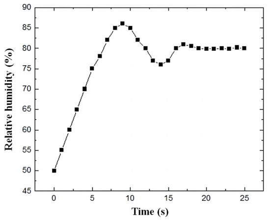 The self-designed bubbling humidifier was used to humidify the cathode inlet air, and the flow rates of humidified air and non-humidified air were adjusted to accurately control the humidity based on the PID control algorithm. The humidifier temperature and the relative humidity were set at 80 °C and 80% after opening the air circulation pump, air inlet solenoid valve, and humidifier. The optimal PID parameters were obtained after automatic debugging, with a proportion coefficient of 2.8, integration time of 3 min, and differential time of 1 min. The humidity control speed was fast, and the margin of error in relative humidification was less than 0.7%. The variation curve of humidity with time is shown in Figure 11.